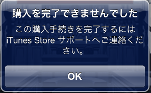 ダウンロードしたアプリ内でアドオンを購入しようとすると「購入を完了できませんでした」と表示されアドオンの購入が出来ないゲームアプリで仮想通貨やチャットアプリのスタンプ等を購入しようとしたらこのようなエラーが出る事があります。※画像は一例です(メッセージの内容が異なる場合があります)