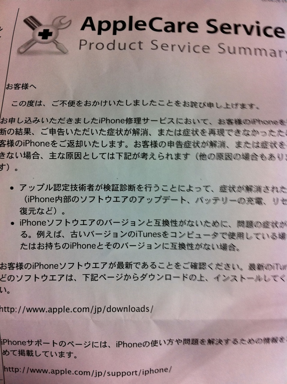 「検証診断の結果、ご申告いただいた症状が解消、または症状を再現できなかったため、お客様のiPhoneを返却します…」