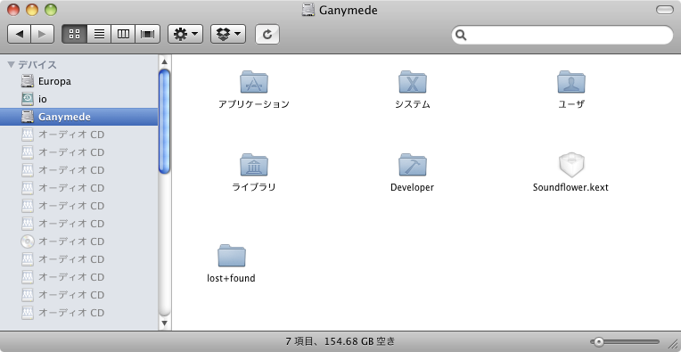 後でFinderのデバイス欄を見ると,グレーになった「オーディオCD」アイコンが並びます(下図).