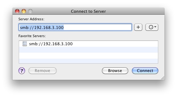 なお、Finderの「Connect to Server...」でsmb://192.168.x.xでは接続できませんでした。