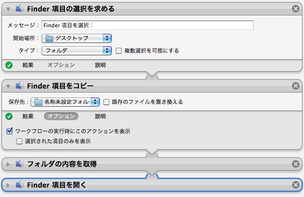 ※不思議と言えば不思議なのですがなんどやっても、ワークフローから実行ではfinderは開かないですね。