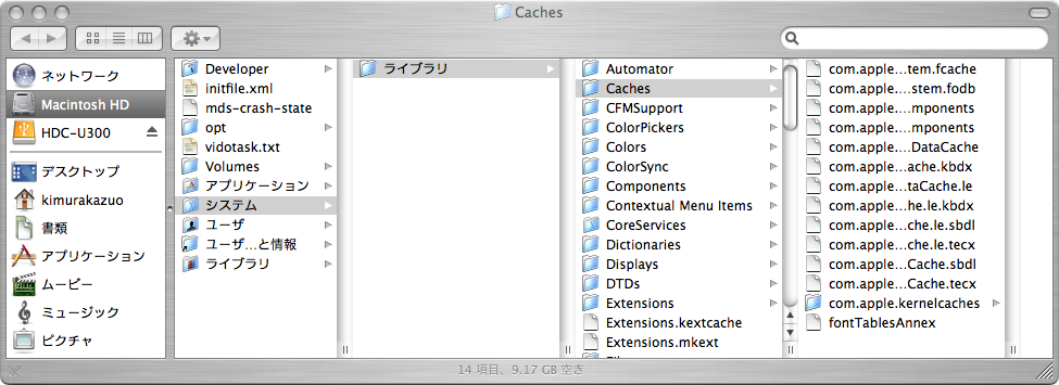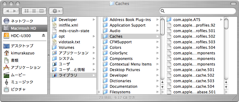 ここでFinderで~/ライブラリ/Caches/*に数多くのキャッシュが、未消去で残っていることを確認。何か消されたのかは不明 ---- (C)
