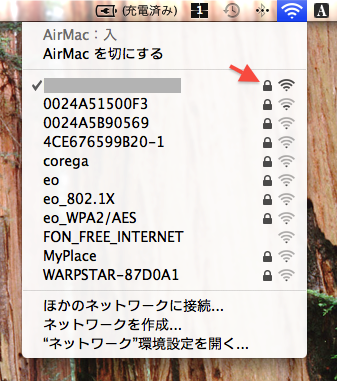 いままでは,メニューバーに表示されるネットワークの名前の右側に鍵のマークが