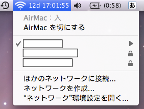 した後、AirMacを入にして、問題のAirMacネットワークに接続し直してみるとか。