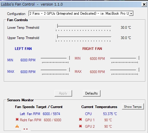 lubbo's macbook pro fan controlでGPUの温度が90度から変化しないとの
