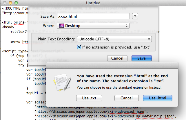 当方(Lion)では.htmlに変更したTextEdit Fileを修正してSaveすると.txtになります。LionをClean InstallしてDataをリンク、設定を行ったもので、Snow LeopardからLionにしたものではありません。