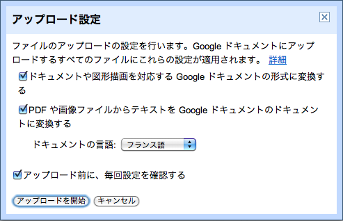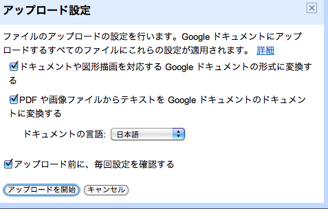 ここで"PDFや画像ファイルからテキストをGoogleドキュメントに変換する"にチェックにアップロードします。