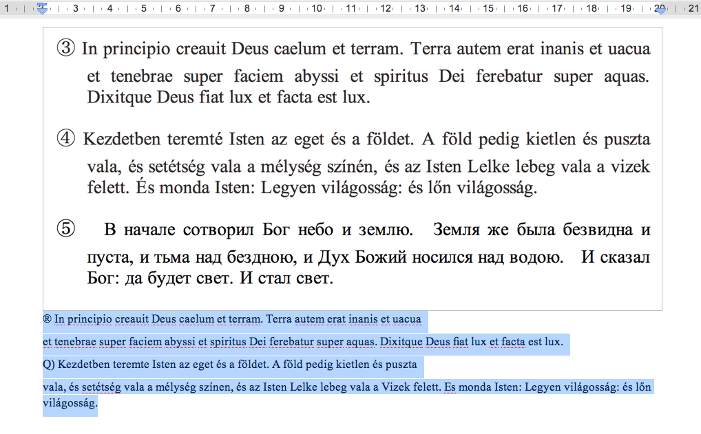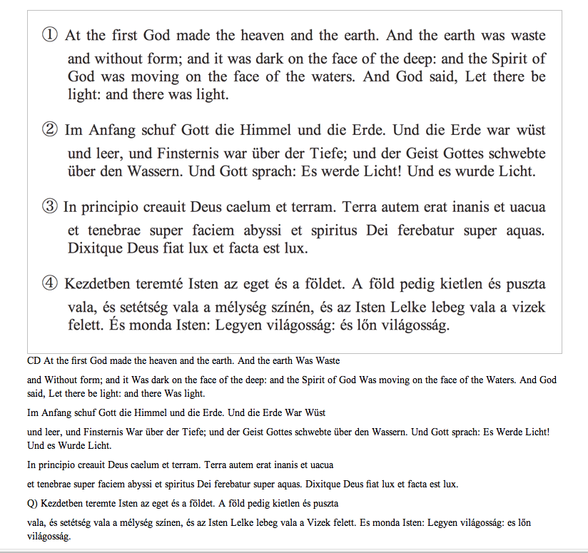 『創世記』の冒頭部分を「英語」・「ドイツ語」・「ラテン語」・「ハンガリー語」で併記してみました。全てラテン文字言語です。