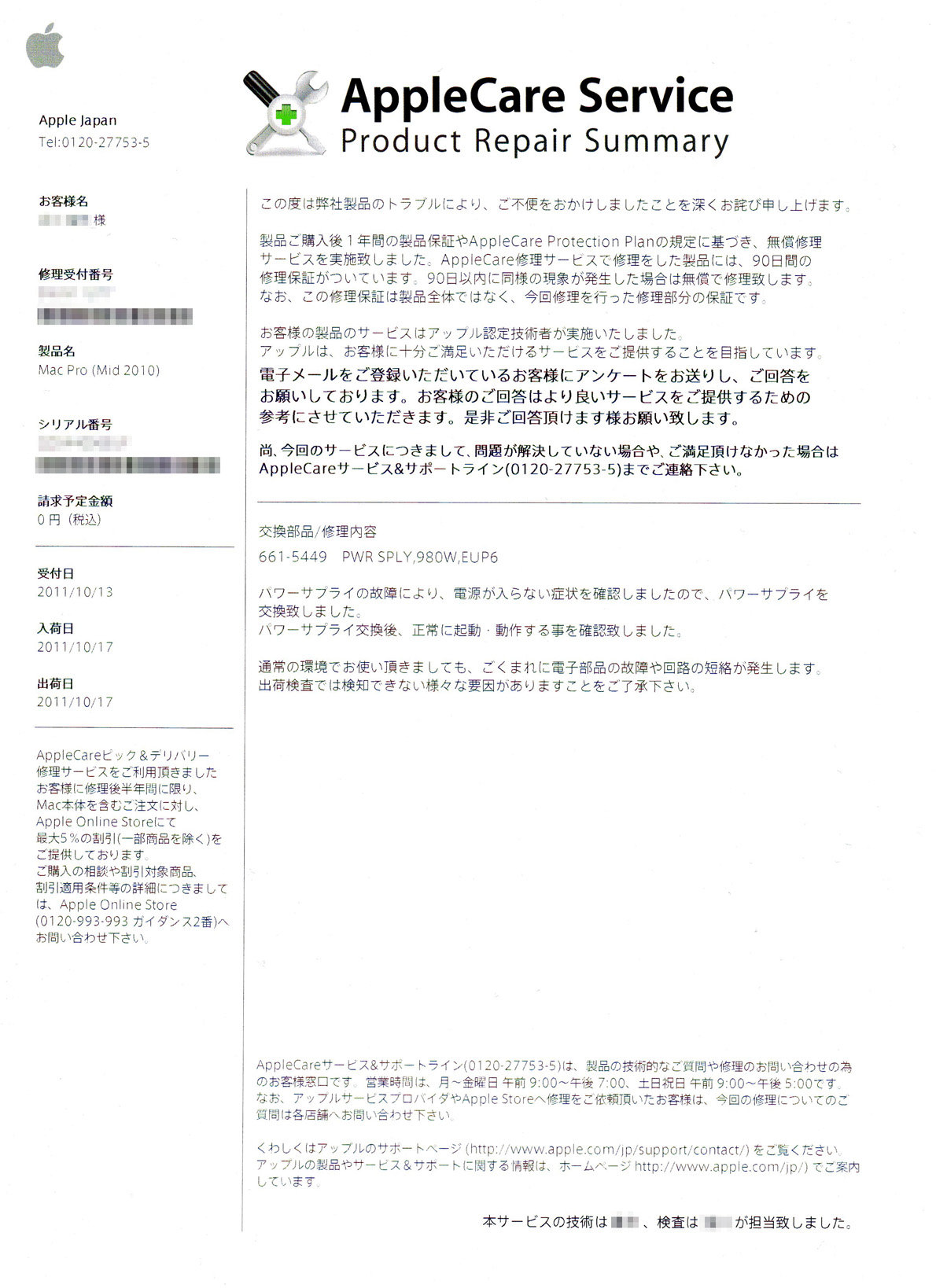 上記、金額等を精査してパーツの交換方法に行き着くまでかなり時間が掛かったので、保証期間外のMac Proで同じような方法をダメ元で挑戦してみたいという人の参考になればと思い書きました。自分の場合は電源ユニットが原因でしたが必ずそうだとも限りません。実行される方はあくまで自己責任でお願いします。
