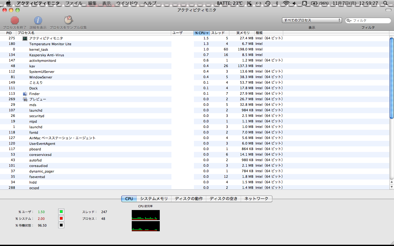 プロセスのCPU使用率を見てもアクティビティモニタが一番使っていて、最大時でも10%程度でした。