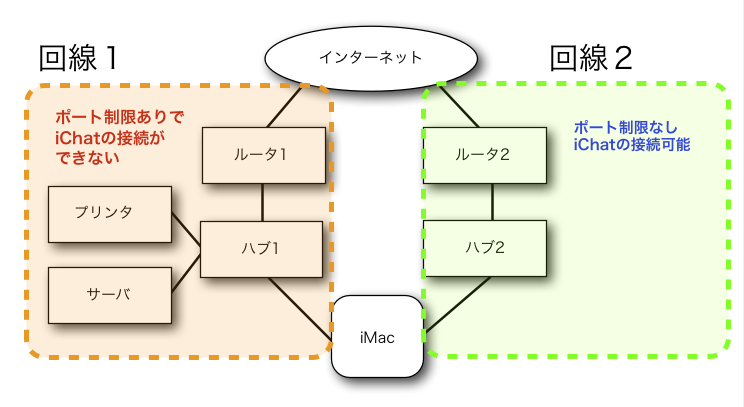 回線1がポートに制限がかかっておりiChatが接続できない状態で