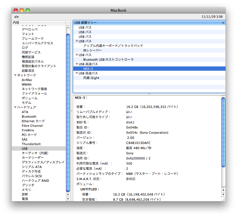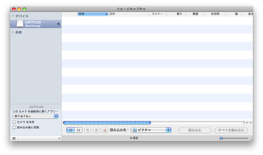 NEX-5をUSB(マスストレージモード)接続し、[ファイル] - [カメラから読み込み...] を選択しても、内蔵iSightカメラが出てくるのみでNEX-5が出てきません。