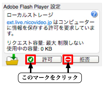 「許可」ということは、プライバシーの設定かと思いますが、システム環境設定にあるFlash Playerの設定から「カメラとマイク」>「サイトごとのカメラとマイクの設定」もうまく動作しないのでしょうか?