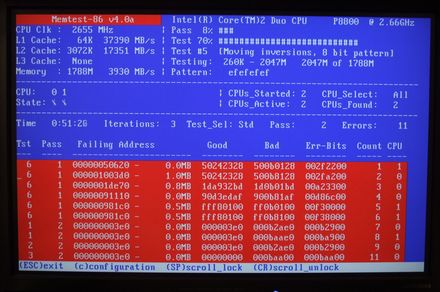 すると、ファイルのコピーでデータが化けるという症状は直ったようではあるのですが、Memtest86の実行中にキーを押すとエラーが発生するという状況です。