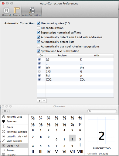 私は『CO2』などの単語を環境設定の『Automatic Correction』に登録して使っています(下図)。これだと、コマンドメニューを選択する必要がないのでとても便利です。 あるいは、キーボードショートカットを設定すると便利ではないかと思います(マニュアルには載っていない小技集(LION))。
