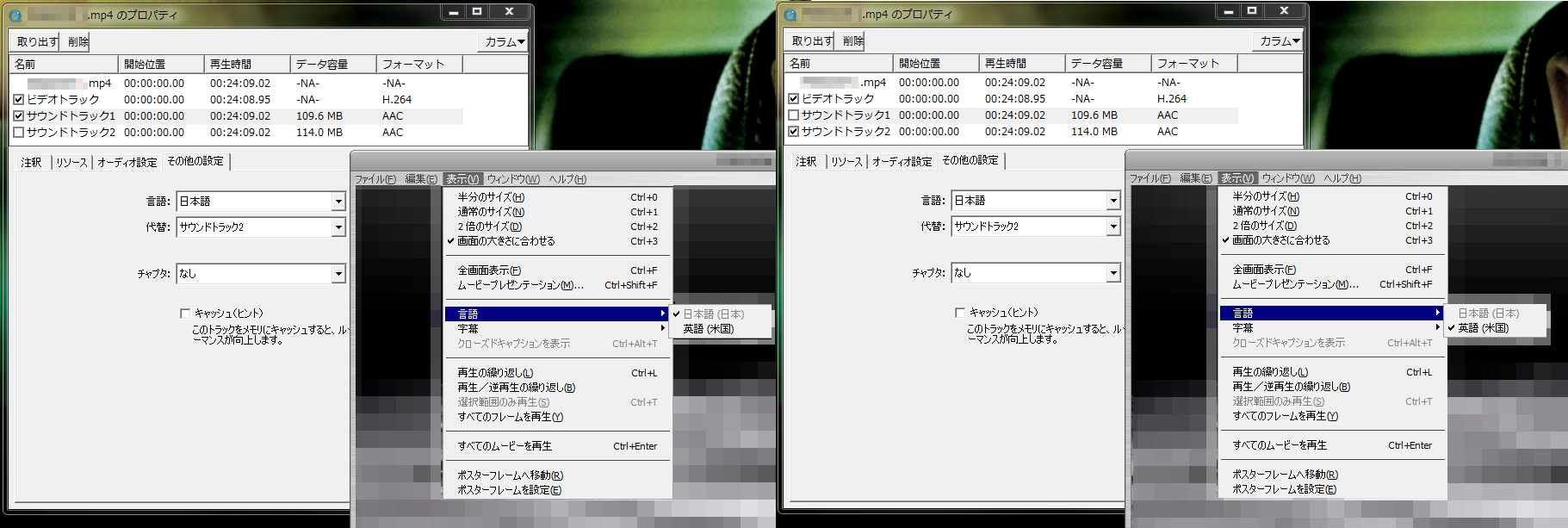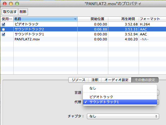 QuickTime Proで、MP4の動画を見ようと思ったのですが、音声の切り替えができません。