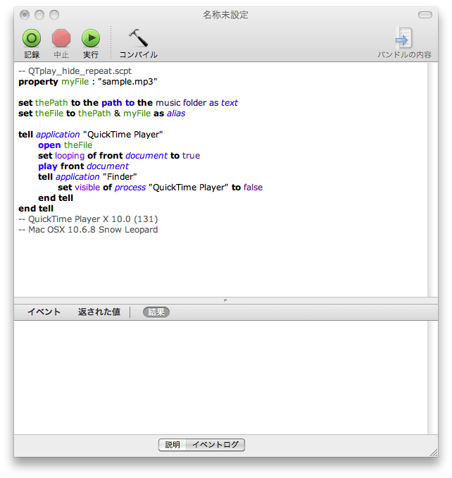 property myFile : "GarageBand:mp3:Thunderbirds.mp3" --再生ファイル例(ミュージックフォルダ内の相対パス)