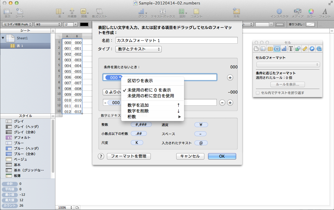 エクセルでは、右クリックして書式指定を開く、らしいですが、Numbers ではどうやればいいかわかりません