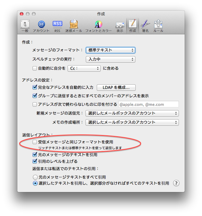 ここにチェックが入っていると、相手がリッチテキストで送って来ると、いくら標準テキストを指定していても、リッチテキストで返信してしまいます。