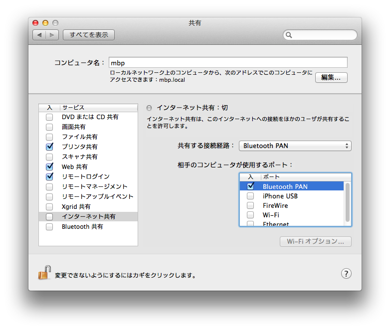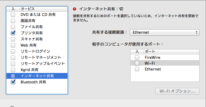 > 試しにfirewire, wifi, ethenetの所にチェックをつけてインターネット共有共有をオンにしてみたのですが、出てくる気配もなく、