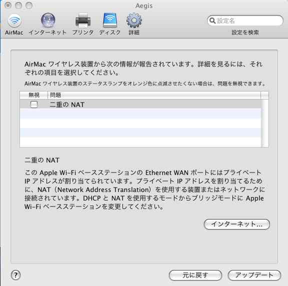 これは、AirMacユーティリティでベースステーションを選んで、表示された概要の所の状況の所に警告(二重のNATと黄色の○印)が表示されていて、そこの黄色の○印の所をクリックしたら、"無視"のチェックボックスが表示されますが、