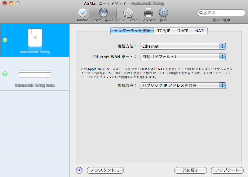 で、詳しい設定方法のマニュアルが見つからないんだけど、とにかく一回リセットして、あらたに AirMac を検出して、その上で、AirMac がインターネットに繋がるように設定すればよいのでは。(設定を変更すると、一旦見失うかもしれないので、その場合は再度接続する、と。)