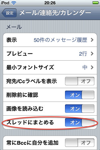 iPhoneの場合は、設定>メール/連絡/カレンダー> スレッドにまとめる