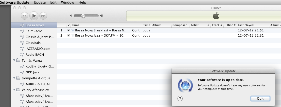 最近、体調を崩して、ITunesやiPhoneで遊んでいます。今日「iTunes 10.6.3」のアップデートの表示が出たので、許可を出したところすぐ終了して、Softoware Updateからの、ポップアップ画面;