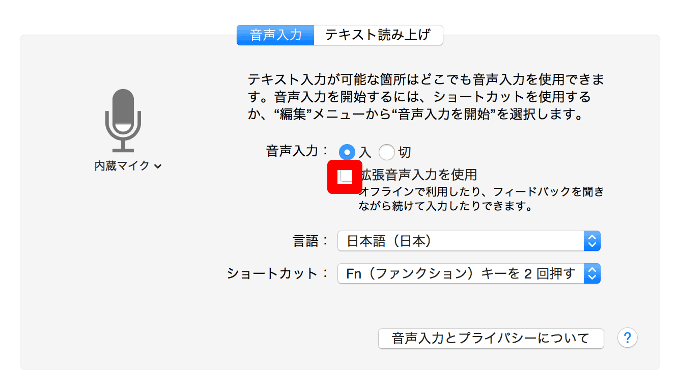 4. システム環境設定の音声入力と読み上げへ行き、音声入力を一旦切って、すぐ「入」に戻す。