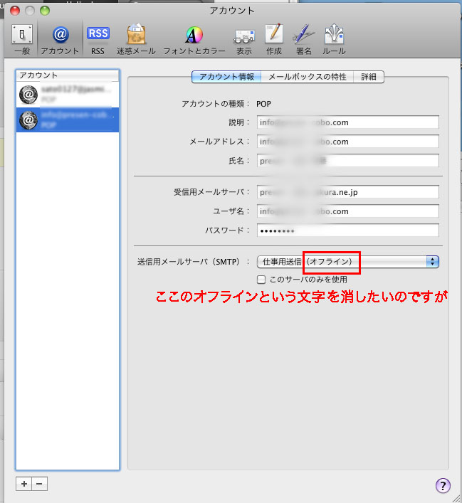 その下、送信用メールサーバ-の所が多くの場合、「オフライン」で繋がりません。
