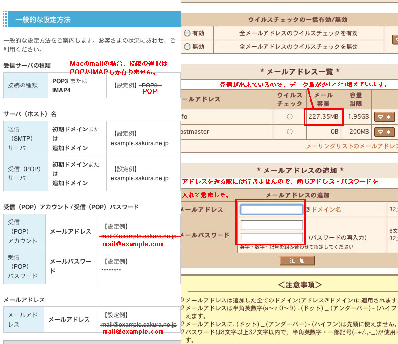 先日、さくらインターネットさんにはいろいろアドバイス頂きましたが、解決出来ずギブアップの連絡が来てしまいました。何度も確かめましたが設定文字に間違いは無い様です。サーバ-の容量制限枠にも達しておりません。