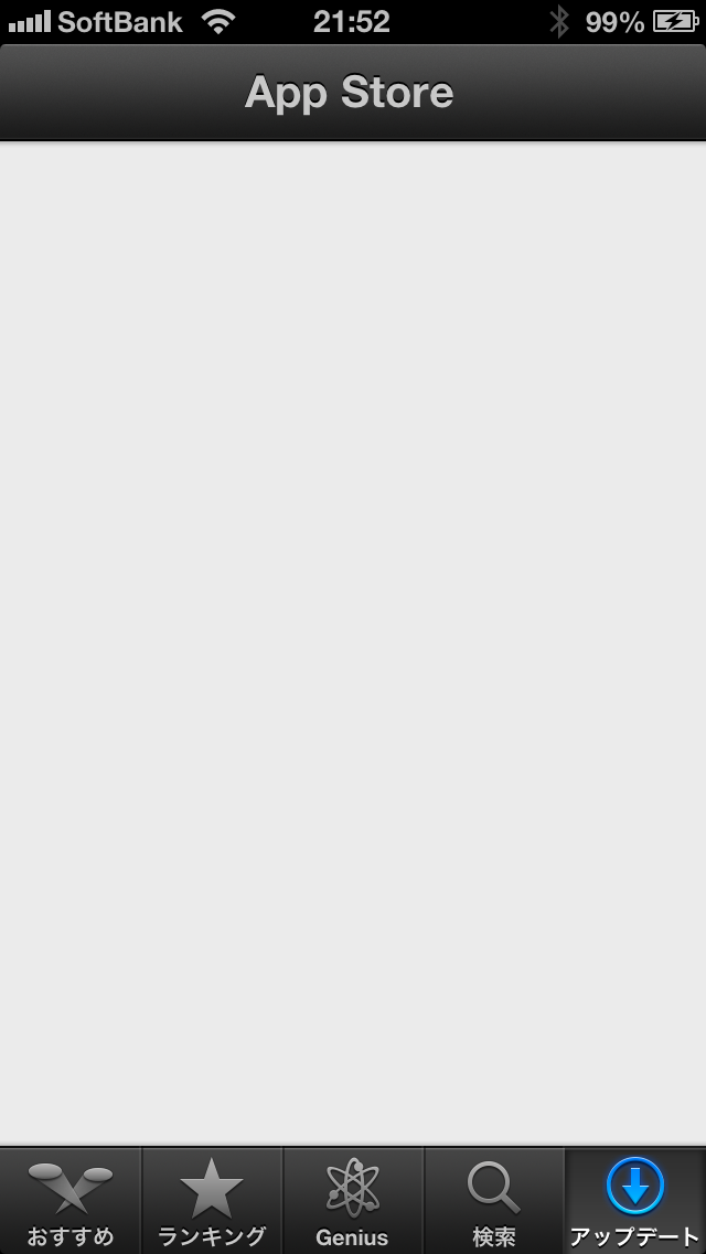 アップデートを施すよう、ホーム画面のApp Storeのアイコンに数字が表示されていたのでアップデートを見ますが、何も表示されません。なので、購入済みAppも確認することができない状態です。