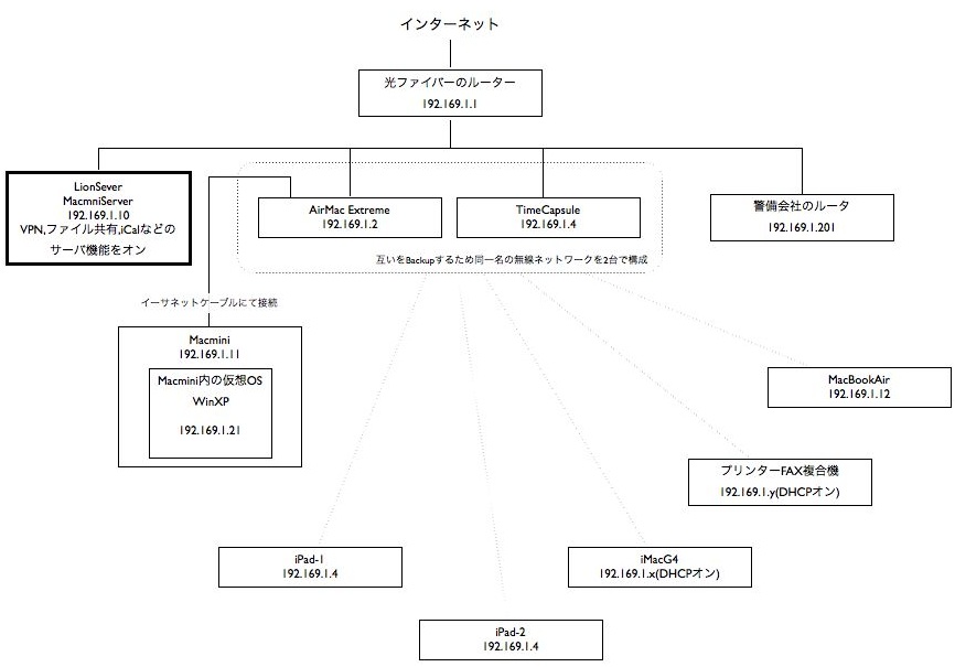 そのルータにぶら下がるように、LionServerとTimeCapsuleが並列でイーサネットケーブルでつながっています。