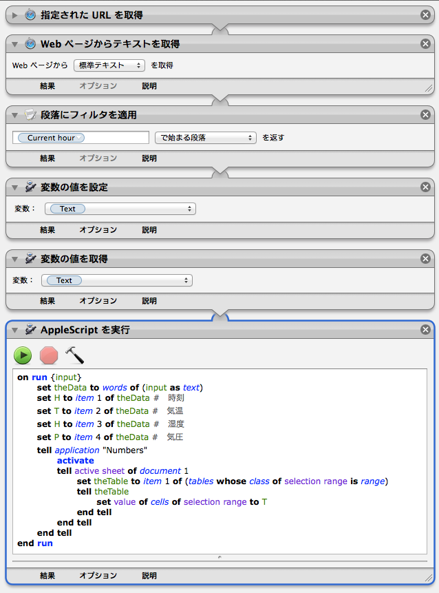 試しに、気象庁のWeb pageにある、アメダスデータの表から富士山の現在の気温データを取得し、Numbersの表の選択したセルに入力するAutomatorのワークフローを作ってみました(下図)。『指定されたURLを取得』アクションには、『富士山(フジサン) 毎正時の観測データ』のURLを入力しています。