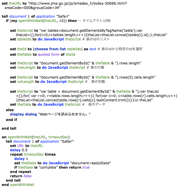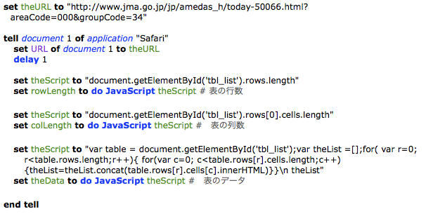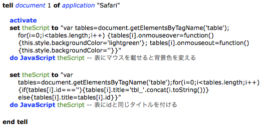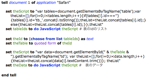 度々、失礼致します。 do JavaScriptコマンドを実行して定義した変数は、Safari?に保持されているようなので、再度、do JavaScriptコマンドを実行する際にそのまま使うことが出来る様です。 なので、マウスクリックで表を選択するイベントを付け加えてみました。