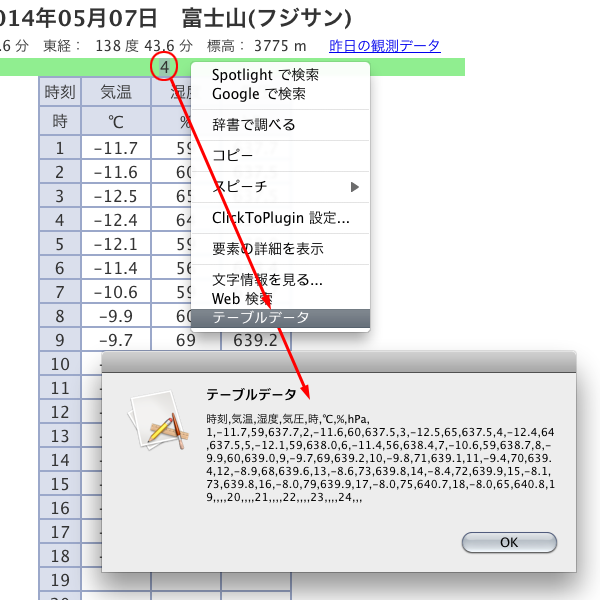 ブラウザ上で選択したテーブルの中身を CSV/TSV で出力...ですが、Camino だと選択部分の HTML ソースが AppleScript で取得できるので、比較的簡単にできそうです。