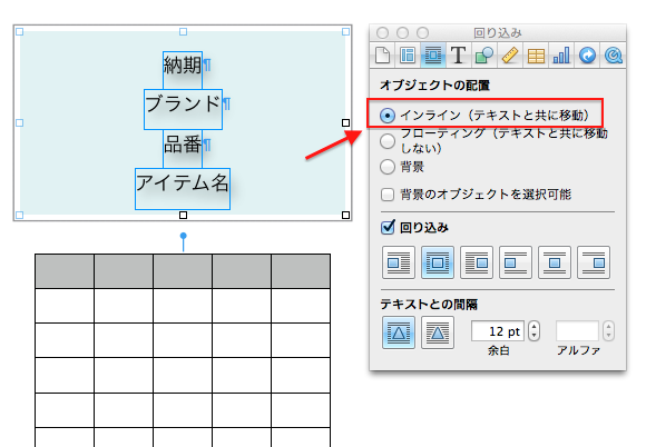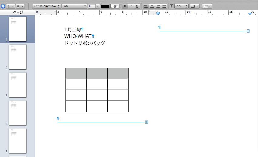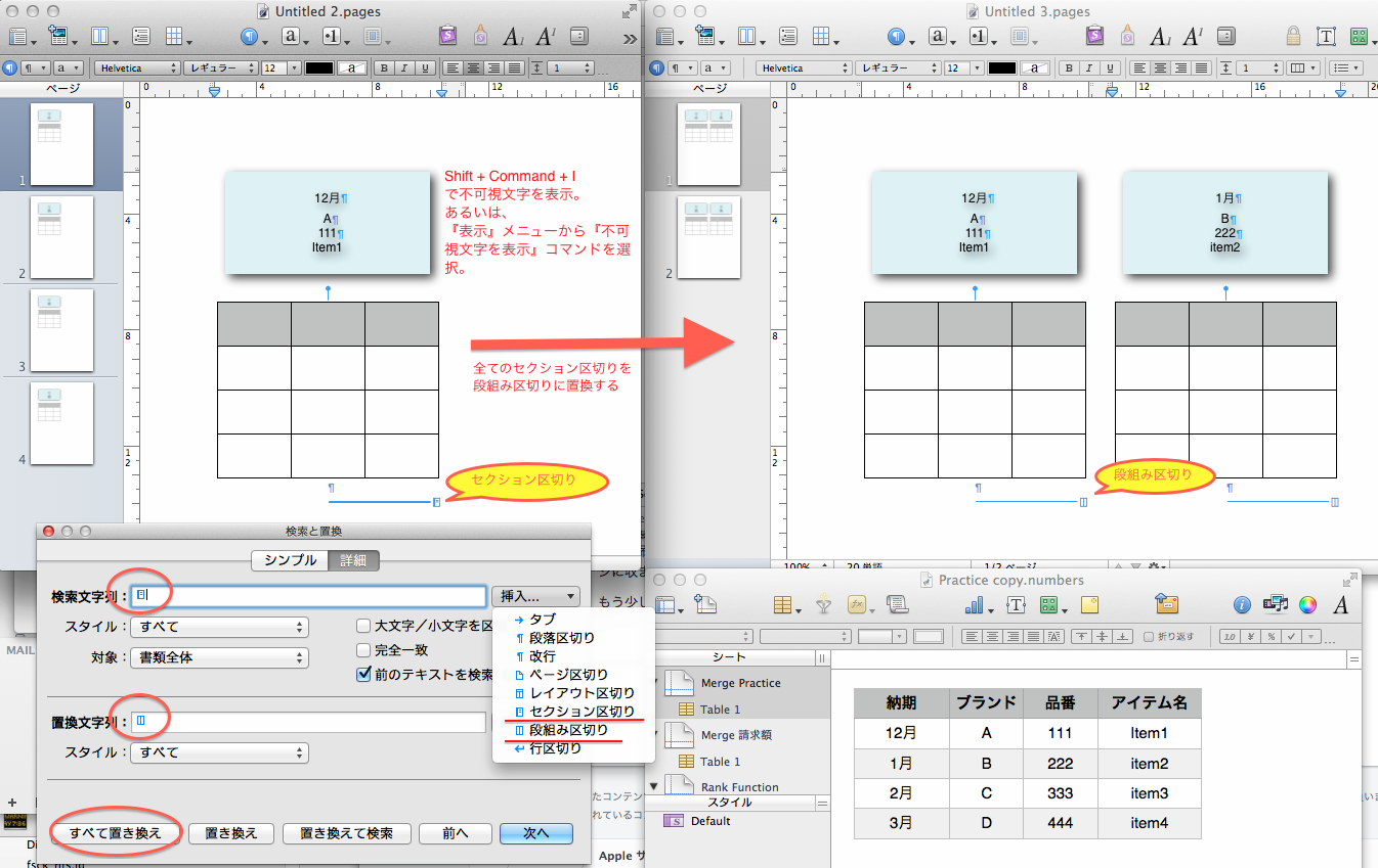 Pagesの段組み機能を利用する方法もありました。 まず、差し込みを行う前のPages書類を二段にします。 最初に添付して下さった画像の様に、ページの左側の段のみにテキストボックスと表を入れておき、右側の段は未記入の状態にします。 次に、この状態で差し込みを行います。 差し込まれたて出来た書類は、一つのレコード毎に『セクション区切り』が挿入されて、差し込むレーコードの数に相当するページが作成されます。 最後に、『検索と置換』コマンドを使って、『セクション区切り』を『段組み区切り』に全て置換すると、1ページに左右の2段で、それぞれ、テキストボックスと表を示すことが出来ます。 下図をクリックして参照してください。