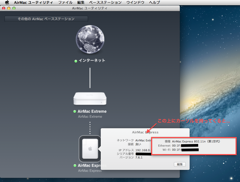 AirMacExpressのMACアドレスの調べ方を教えて下さい。AirMacExpressは現在販売中の、長いACコードがついたものです。