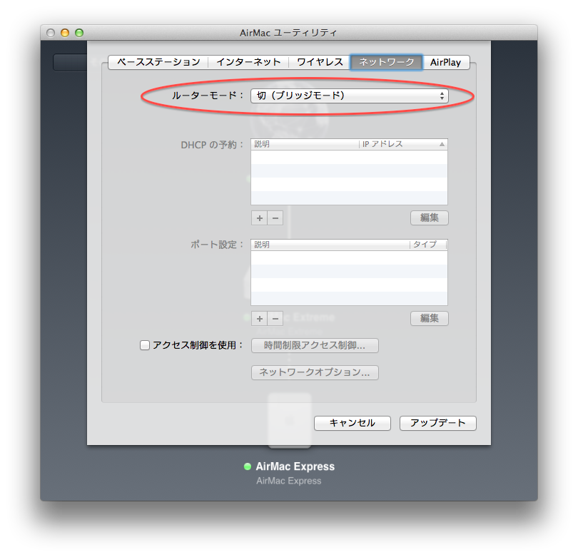 ルータ「RT-S300SE」を初期設定状態にリセットした後、いったん「Air mac Express」とルーター「RT-S300SE」のLANケーブルをはずし 「RT-S300SE」とパソコンとBaffalo社ネットワークHD 「LS-WV2.0TL/R1」の 3台のみの有線LANの最小構成にしてから、IPアドレスをBuffalo社指定のごとく設定。再度無線LAN配線に戻し、そこでAir macを「ブリッジモード」に設定せよということでしたが、ブリッジモード設定の仕方がわかりません。