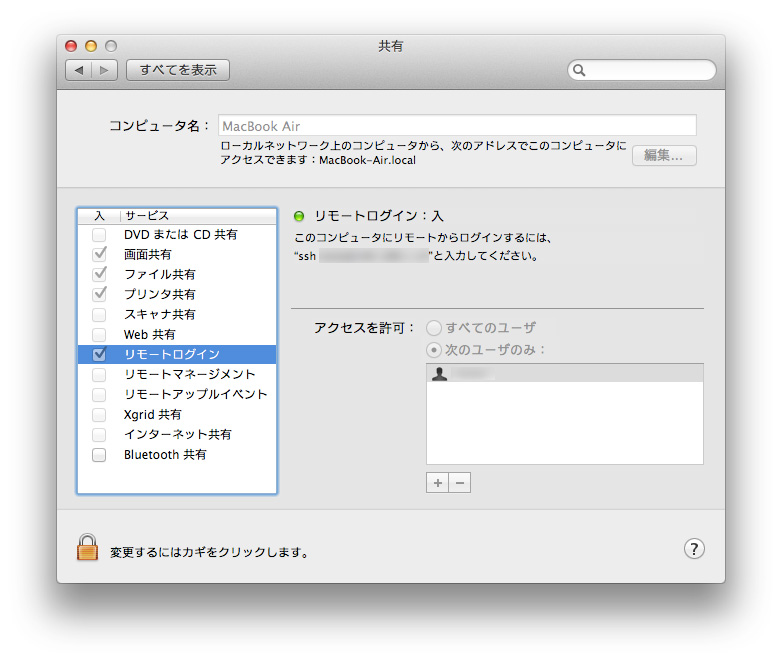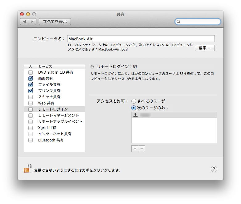 タイトル通りのトラブルなのですが、外部からSSHで自宅のMacBook Proや職場のMacBook Airにアクセスする必要があるため、「システム環境設定」→「共有」で、「リモートログイン」にチェックを入れています。