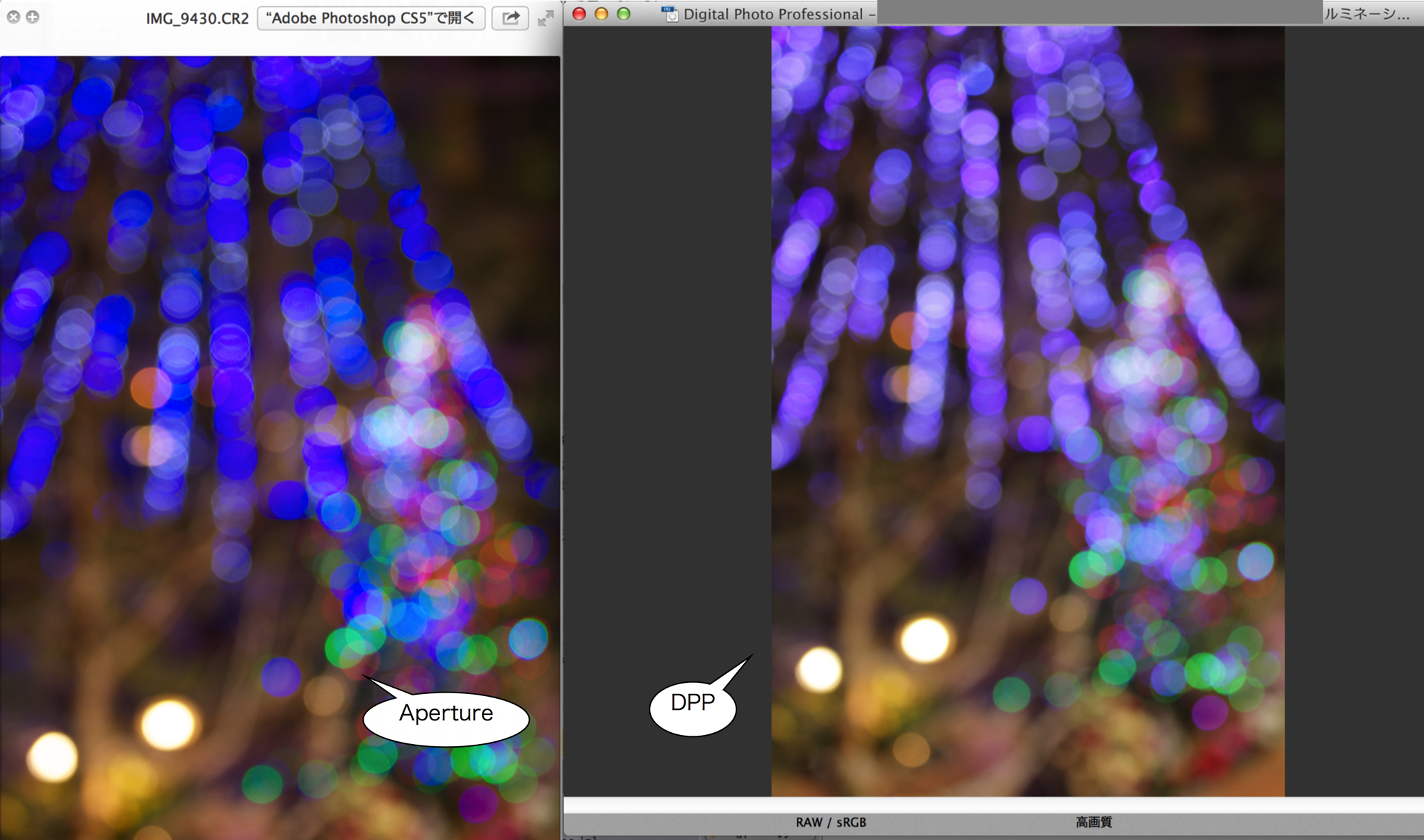 最近 Aperture を使っていて RAW 画像を読み込むと、添付した画像(左)のように元画像(右)とかなり異色な仕上がりになってしまうようになりました。