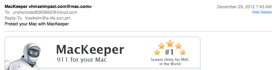 失礼致します。 私のところにも同じようなアドレスでメールが届きました(下図)。 何と、あの『MacKeeper』の宣伝メールでした。 完全にスパムメールですね。 早速、迷惑メールとして処理しました。