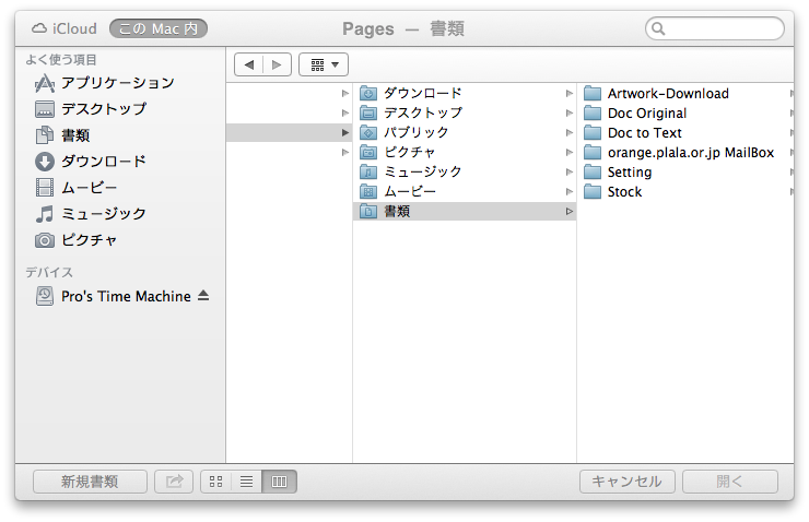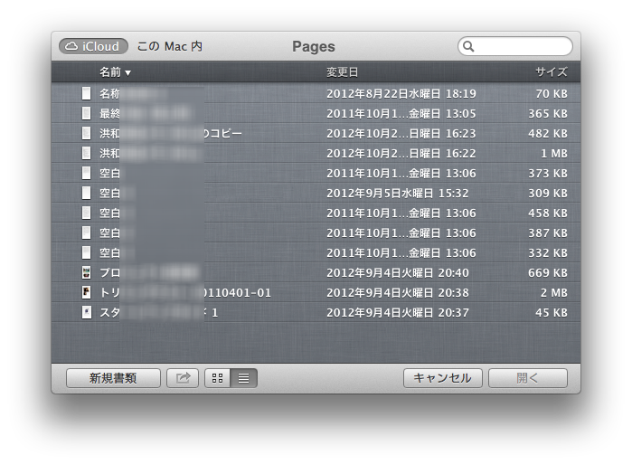 iCloud.com上で表示されるファイルはアイコン表示しかできないですね。 Mac OS X 10.8をお使いであれば、PagesのiCloud Document Library上でリスト表示が可能です。 Mac OS X 10.7をお使いであれば、Finderで ~/Library/Mobile Documents/com~apple~Pages/Documentsへ移動するとiCloud.com上にあるファイルの一覧が表示されますが、このディレクトリはデフォルトで不可視になっており、あまりいじらない方がいいかもしれません。