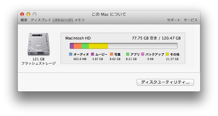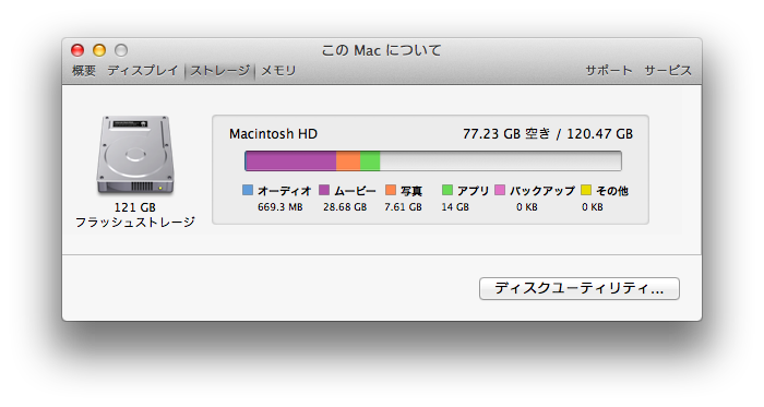 デスクトップ上の左上のAppleマークから、このMacについてに入り、ストレージの情報を確認したところ、120GBの容量の内訳が「オーディオ670MB/ムービー28GB/写真8G~」のような表示になっていました。