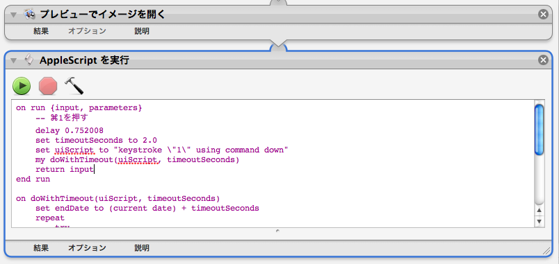 AppleScriptはAutomatorの自動記録をAppleScriptに変換しただけで、AppleScript自体私はさっぱりわかりませんので、あしからず。