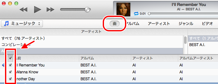 前者のチェックマークというのは、リスト表示にしたときに曲名の前にあるチェックボックスのことを示しています。