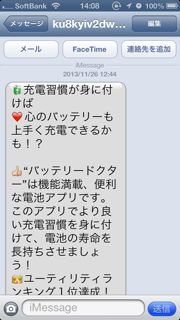 当方では2013年秋から”バッテリードクター”というアプリの宣伝メッセージがiMessageで複数回届くようになりましたので、Appleに報告しました。