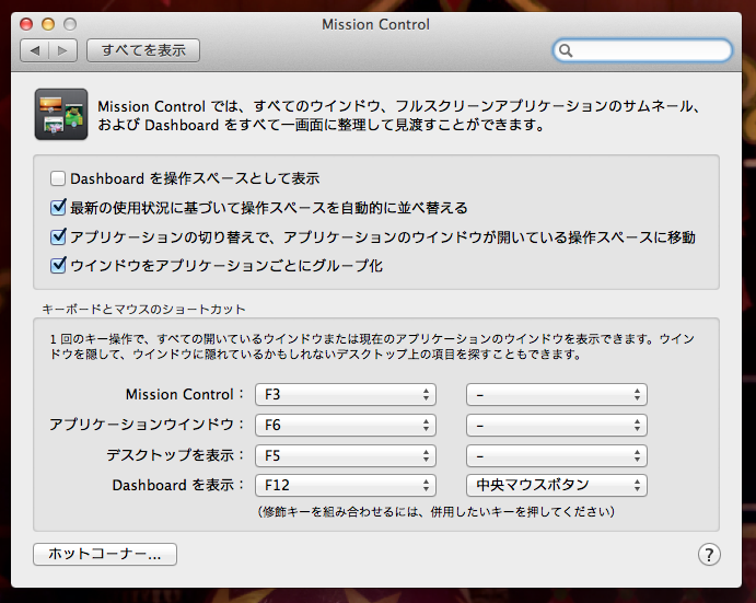 ちなみに怪しそうな「Mission Control」の設定もいろいろいじってみましたが、改善されません。
