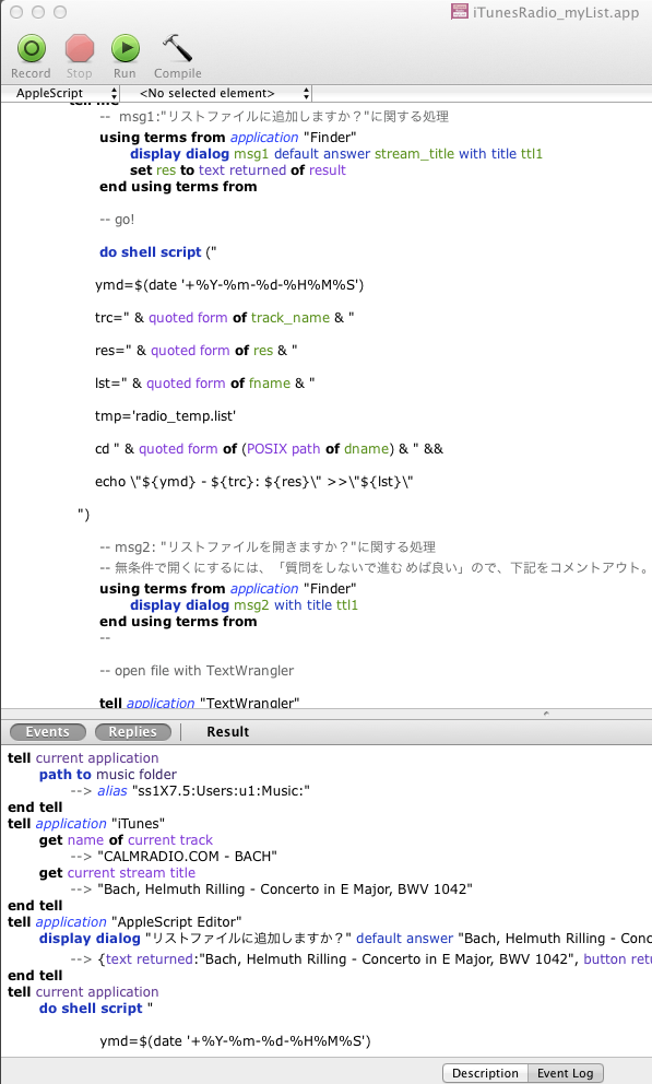 こんな感じでどうでしょうか?互換性よりも可読性重視の書き方に変更。Automator AppleScript では動かないと思います。また、秒まで入っているのでソートは省きました。あと、行頭インデントがタブだったりスペースだったりするとあまり良くないので、このままペーストしてください。