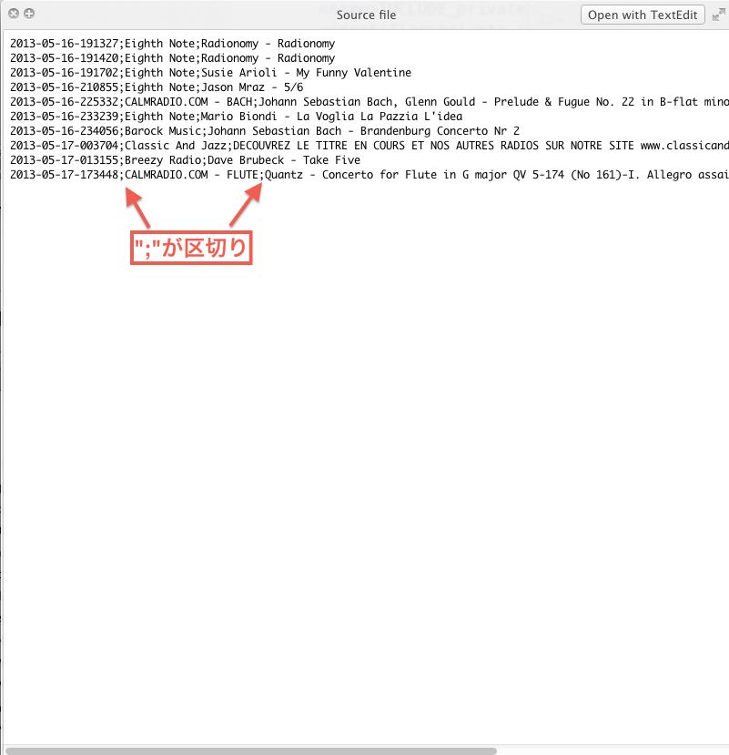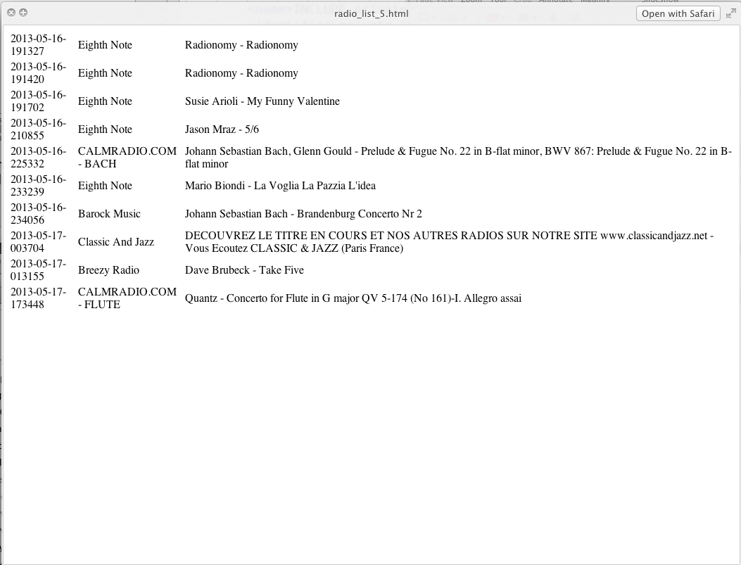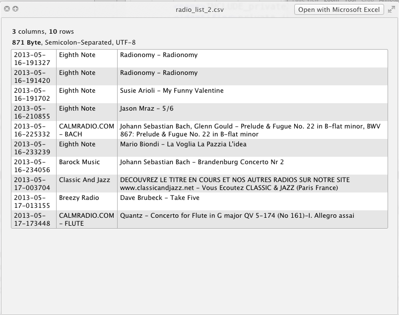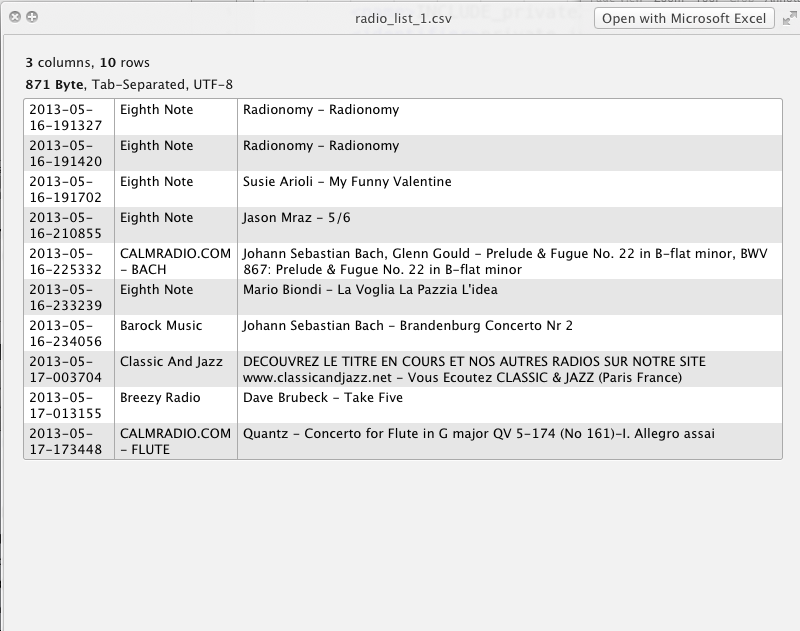 別途のシェル・スクリプトで~/Music/radio_list.txtからtab区切りのファイルを生成して、それをexcelで眺める様に出来ないかと思う様になりました。